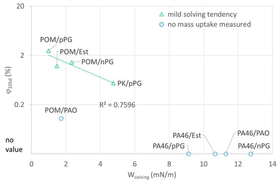 Relative mass uptake versus solving energy (Wsolving) for different polymer–lubricant pairings after an estimated long-time storage in the lubricant indicated by the labels. The systems that showed no mass uptakes were included to visualize the range of theoretical extrapolation of possible uptake for PA46 systems.