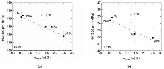Figure 5 shows the Martens’ (HM) and Vickers (HV) hardness at a depth of 300 µm below the sample surface after storage in the lubricants or under a nitrogen atmosphere. Since for PA46 no sorption could be measured, the hardness data are not plotted versus lubricant uptake.