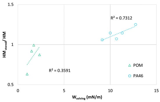 The significant decrease in HMstored/HM for the POM-lubricant pairings (Wsolving < 5 mN/m) with decreasing Wsolving reflects the swelling tendency of those systems (see Figure 3). Thus, Wsolving is for the POM-pairings an (inverse) measure of the sorption tendency of organic lubricants.