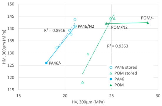 As stated above, the measurement of Martens’ hardness (HM) and Vickers hardness (HV) at the same position allows a certain separation between possible elastic (HM) and plastic (HV) contributions. Therefore, in Figure 7, HM is plotted versus HV measured at a depth of 300 µm. It can be concluded that the swelling and the related plasticization of the POM-pairings (open triangles in Figure 7) are accompanied by a reduction in both elastic and plastic contributions (related to HM). The corresponding comparison between unaged POM and POM stored in a nitrogen atmosphere (filled triangles) shows a strong reduction in the plastic fraction, represented by the Vickers hardness (HV), while the Martens’ hardness HM is almost unchanged by the thermal treatment. One possible explanation is an increase in chain mobility responsible for shear or creep, which is due to the degradation of chains in the rubbery amorphous phase of POM without any significant change in rubber-elasticity. In pristine PA46, the amorphous phase is in the glassy state, and the degradation during aging may increase both elastic (HM) and plastic contribution (HV).