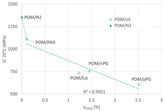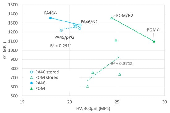 Figure 9 plots the shear modulus G′ against the Vickers hardness (HV) at 300 µm depth for samples stored in oil and in nitrogen. The shear modulus values are for a temperature of 20 °C, which is above the glass transition temperature for POM in the plateau region, where the amorphous phase is in a rubbery state.