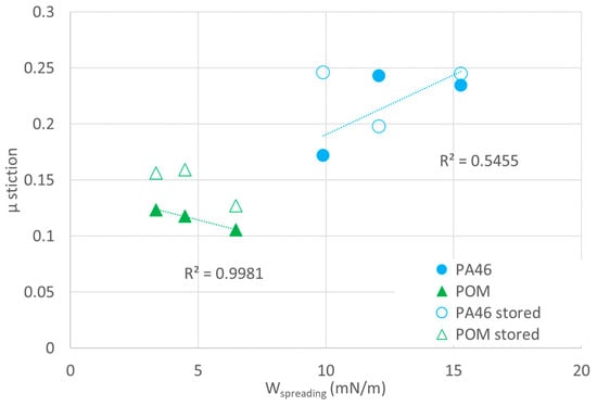 PA46 (blue circles), which does not show mass uptake in the organic lubricants, shows an increase in µ stiction in Figure 10 with the spreading energy for both the samples stored in the lubricants as well as the pristine samples (open circles). Since the tendency for spreading decreases with increasing values of Wspreading, the positive slope can be explained by an increase in the adhesive contact with decreasing spreading.
