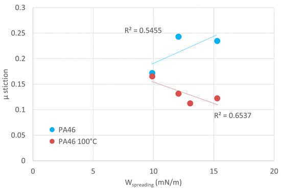 In Figure 11, µ stiction is shown as a function of the spreading energy for PA46 measured at room temperature (blue circles) and at 100 °C (read circles). At room temperature, dry PA46 is tested below its glass transition temperature (Tg), whereas at 100 °C, it is tested above Tg. The chain mobility is almost frozen in the glassy state, and therefore, the increase in the adhesive contact with decreasing spreading is a dominant mechanism (see Figure 11). Above the glass transition temperature (red symbols), the chain mobility is expected to become more important. The temperature dependence of a rate and state conditions is the reason for lower values of µ stiction at 100 °C [5]. Such an increase in chain mobility is similar to plasticization by sorption of an organic liquid, with similar effects on stiction as plasticization by a “solvent”. Unfortunately, the surface energy of PA46 at 100 °C could not be measured by contact angles to test the concept of interaction energies below to above the glass temperature. An equivalent test for POM was not possible since the glass temperature was as low as −70 °C. It should be mentioned that above the glass transition temperature, solvent transport becomes easier, and an additional plasticization effect cannot be excluded.