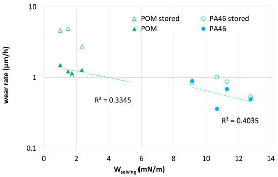 To systematize the tribological results, Wsolving is used in Figure 12 and Figure 13 as an indicator for sorption, solubility and plasticization but also for degradational mechanisms. The run-in wear rate shows a tendency to decrease with increasing solving energy Wsolving. The wear rate is somewhat lower for the pristine samples. For the POM-pairings, the decrease in wear rate with Wsolving can be related to the plasticization by the lubricants, which is also expected for the upper layers of the pristine sample due to the lubricant applied during the experiment. The swelling and plasticization are expected to increase the contact and/or to lower the chain interactions responsible for cohesive failure. The reason for the decrease in the wear rate with increasing Wsolving for the PA46-pairings is not clear yet. However, one may speculate that near-surface interactions such as hardening by chemical and/or morphological changes in crystallinity as well as brush-like dangling or solved chains, etc., which are represented as well in Wsolving, influence the wear rate.