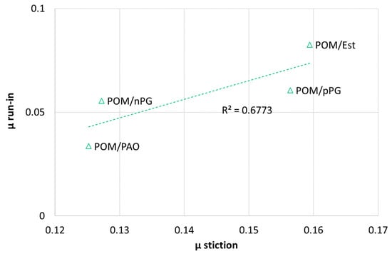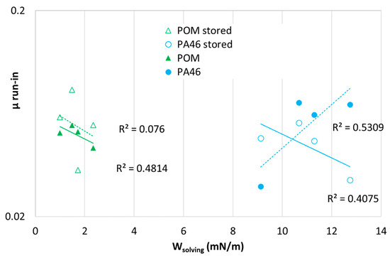 In Figure 13, no systematic correlation between the friction coefficient (µ run-in) and solving energy for the stored POM samples was found. For PA46, which is not swollen by the lubricants, µ run-in appears to have a slight tendency to increase with the solving energy solely because of the spreading behavior. For the others, an increase in µ run-in with the solving energy should indicate polymer–lubricant interface interactions localized close to the surface and, in the case of POM, related to property changes due to sorption and plasticization in the bulk.