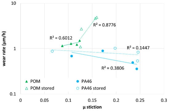 Run-in wear rate versus µ stiction for POM (triangles) and PA46 (circles) prior to (filled symbols) and after storage in the lubricants (open symbols).