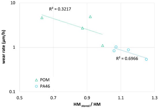 In Figure 15, the run-in wear rate is plotted versus the ratio HMstored/HM for samples stored for POM (triangles) and PA46 (circles). With an increasing surface hardness ratio (HMstored/HM), the run-in wear rate does decrease. It is generally expected that an increase in the surface hardness leads to a decrease in real contact area and, consequently, to a reduction in the wear rate. In the case of POM-lubricant pairings, the softening due to mass uptake and plasticization leads to the expected increase in the wear rate (Figure 16).
