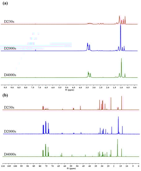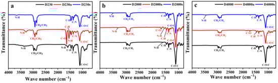 In the 1H NMR spectrum, the peak at 0.6 ppm–1.3 ppm represent -CH3/-CH2−, and the peaks at 2.2 ppm–2.7 ppm represent -CH2− connected with NH. The peak intensity here gradually decreases with the increase of molecular weight, resulting from the gradual decrease of the proportion of NH in the molecule. The peaks between 3.0 ppm and 3.5 ppm represent -OCH2−, and the peak displacement was found towards the low field for D2000s and D4000s. This may be because the oxygen-containing functional groups have an unshielding effect on the hydrogen on the -CH2− group. With the increase of oxygen-containing functional groups, the hydrogen displacement on -OCH2− gradually increases. Figure 2b illustrates the comparison results of 13C NMR, in which the peaks at 73 ppm–75 ppm represent -OCH2−, the peaks at 47 ppm and 52 ppm correspond to -CH2− associated with NH, and the peaks at 13 ppm–31 ppm correspond to -CH3/-CH2−. It can be seen that -CH2−(NH) gradually weakens with the increase in molecular weight, while the strength of -OCH2− increases significantly after the molecular weight exceeds 2000, resulting in the significant increase in the -OCH2− proportion.