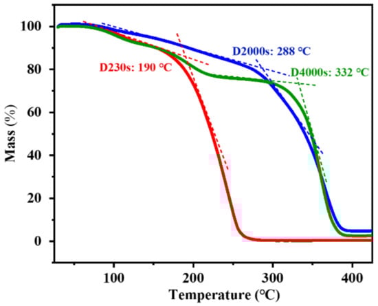 Figure 3 shows the thermogravimetric curves of three alkylation derivatives of polyether amines with different molecular weights. The thermogravimetric curves indicate that molecular weight has a direct influence on the thermal stability of the alkylation derivatives of polyether amine. With the increase of molecular weight, the slope of thermal decomposition curve becomes low and the decomposition temperature increases. Among them, the initial decomposition temperature of D230s was about 190 °C, and the final decomposition temperature was 280 °C. The initial decomposition temperature of D2000s rose to 288 °C, and the final decomposition temperature was 390 °C, indicating that the thermal stability of D2000s was significantly improved. When the molecular weight of polyether amine continues to increase to 4000, its alkylated product D4000s experienced two short thermal weight losses below 220 °C and began to decompose at 332 °C, indicating that there was a small amount of low molecular weight polymer in D4000s. Overall, the thermal stabilities of D2000s and D4000s were close.