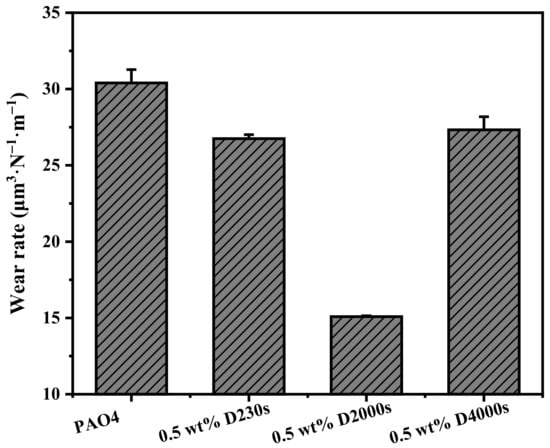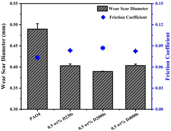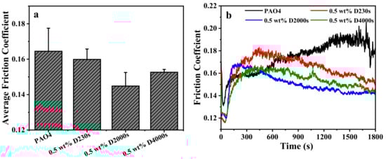 Figure 7 compares the friction coefficients of polyether amine alkylated derivatives under UMT point-on-flat friction tests. Compared with the base oil (with an average friction coefficient of 0.164), adding 0.5 wt% polyether amine derivatives with different molecular weights can improve the friction reducing performance to a different extent (0.159–0.145). The friction coefficient of lubricant with D2000s was 0.145, which was 11.6% lower than that of the base oil. When the molecular weight increased to 4000, the friction coefficient increased slightly.