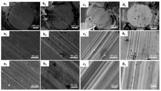 Comparison of wear scar morphology in four-ball friction tests (a1/a2/a3: PAO4; b1/b2/b3: 0.5 wt% D230s; c1/c2/c3: 0.5 wt% D2000s; d1/d2/d3: 0.5 wt% D4000s).