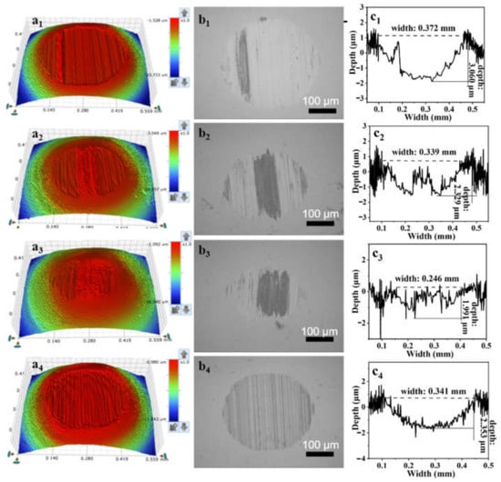 Three-dimensional shape, micrographs and size of wear marks of steel balls after UMT point-on-flat friction tests (a1/b1/c1: PAO4, a2/b2/c2: D230s in PAO4, a3/b3/c3: D2000s in PAO4, a4/b4/c4: D4000s in PAO4).