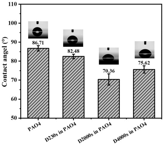 To investigate the adsorption mechanism of polyether amine derivatives as OFMs, the addition concentration was increased to 2.0 wt% for water contact angles measurement of the steel surfaces. When the concentration of polyether amine derivatives increased to 2.0 wt%, the antifriction performance trend was consistent with that mentioned above (Figure S4). Water contact angles were measured to estimate the adsorption ability of the polar additives on the steel surfaces (Figure 10). The dipping and rinsing process involved submerging a steel plate in the lubricant with or without polymer molecules for 2 h at r.t. After that, the oil on the steel plate was washed with toluene and then dried in air. The contact angle of the steel plate surface was then tested. It can be seen from the result that the addition of the polyether amine derivatives led to the reduction of contact angles of the steel surfaces, which indicated that the polarity of the surfaces had increased. Specifically, the contact angle of the surfaces treated with different polyether amine derivatives decreased with varying degrees (70.36°–82.48°). The contact angle of the surface treated by D2000s was the lowest among the three additives (70.36°), indicating that the amount of adsorption was the largest among the three additives. The contact angles of the surfaces treated by D230s and D4000s were 82.48° and 75.62°, respectively. From the perspective of the change trend of the contact angles, it gradually decreased and then slightly increased as the molecular weight of the polyether amine derivative increased. It can be hypothesized that the alkylated polyether amine derivatives as lubricating additives can be adsorbed on the surface of the steel to different degrees. Additionally, the molecular weight will affect its adsorption capacity, and the derivative with a molecular weight of 2000 exhibited superior adsorption performance.