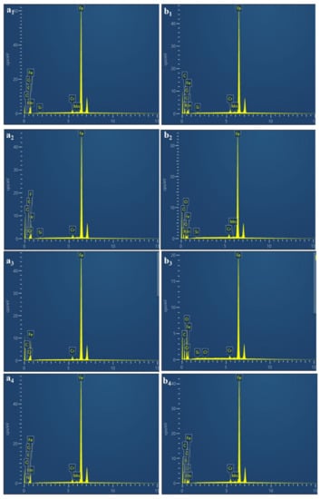 Comparison of the EDS energy spectra of the deposits at the grinding spots and their edges (a1/b1: PAO4; a2/b2: D230s in PAO4; a3/b3: D2000s in PAO4; a4/b4: D4000s in PAO4).