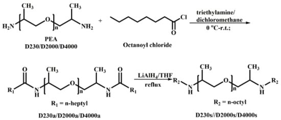 Octanoyl chloride (99.0%), Polyether amine D230, D2000 and D4000, triethylamine (TEA, 99.0%), LiAlH4 (97.0%) and tetrahydrofuran (THF, 99.5%) were purchased from Adamas Chemical Reagent Co., Ltd (Shanghai, China) and Energy Chemical Reagent Co., Ltd. (Shanghai, China). The synthetic route was listed in Scheme 1.