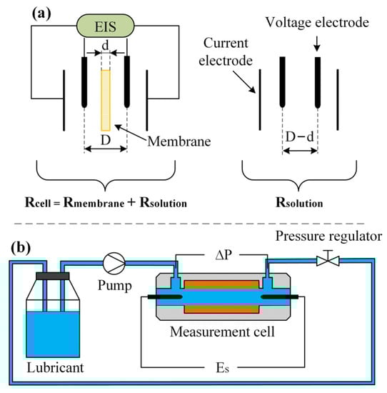The EDL is a phenomenon in which the net charge concentration near the solid/liquid interface is much higher than the liquid phase bulk, as shown in Figure 1. If the solid phase is an annular structure (such as pores in a membrane) and the intracavity diameter is about twice larger than the EDL thickness, it can be considered that the intracavity ions are distributed in the EDL structure; that is, the intracavity liquid conductivity is approximate to the EDL conductivity. The EDL thicknesses of different liquids were firstly calculated with the Poisson–Boltzmann equation. In this paper, the liquid EDL thicknesses are within 50 nm. To avoid the overlap of the EDLs in a membrane pore, the alumina ceramic flat membrane with a pore diameter of about 100 nm was selected for the measurement. The measuring liquid was then pumped through the ceramic membrane for 30 min. Next, the membrane was soaked in this liquid for 24 h to ensure that all pores were filled with the liquid. The membrane resistance was measured using electrochemical impedance spectroscopy on the galvanostatic four-electrodes system to calculate the liquid conductivity within a pore, i.e., the approximate conductivity of the EDL (the deduction details are presented in Appendix A), as shown in Figure 2a. The resistance measurement was carried out in the cell with a membrane immersed in the measuring liquid and the cell with a lone liquid, respectively, to obtain the total resistance of the liquid and membrane (Rm + Rsol) and the resistance of the liquid (Rsol). The membrane resistance Rm can be obtained by subtracting the two values. The dimension “D” in Figure 2a was the distance between the two voltage electrodes when the membrane was immersed in the cell, and “d” was the membrane thickness. In addition, the liquid bulk conductivities were measured using a model DDS-307A conductivity meter.