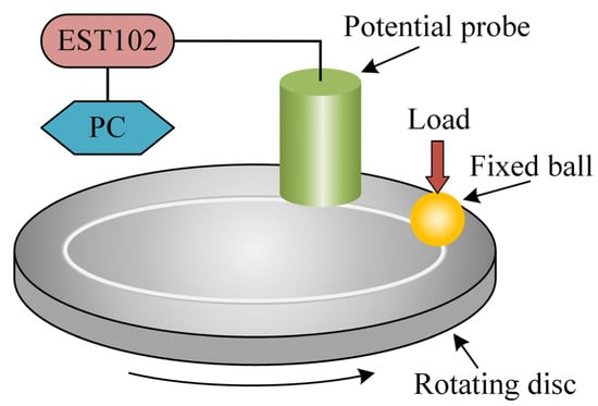 A W1 three-dimensional optical profilometer (CHOTEST Instrument Co., Ltd., Shenzhen, China) was used to analyze the worn surface morphologies of the ceramic and steel balls lubricated by water. The geometric parameters of the surface profile were used as the basis for establishing the capillary model at the friction interface. A ball-on-disc material friction device was developed to explore the tribo-electrification between ceramic and steel, as shown in Figure 3. The diameters of the ball and disc were 6 and 75 mm, respectively. The friction load was 1 N, and the sliding velocity was 157 mm/s. Once the disc slipped out of the friction zone, its potential was detected by an EST102 electrometer placed 10 mm above the disc surface. The triboelectrification characteristics of the ceramic (or the steel) were obtained by switching the paired combinations of ball/disc materials. According to the capillary model and the ceramic/steel triboelectrification results, the distribution of tribo-induced electric field within the friction interface was simulated and analyzed with the finite element software ANSYS.