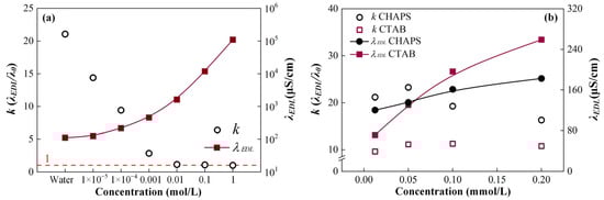 The bulk conductivities of the diluted lubricants prepared in this paper and the corresponding membrane resistances are listed in Table 2. Figure 4b shows the relationships of CHAPS and CTAB concentrations with the EDL conductivity and k. The EDL conductivities of both types of lubricants are higher than their bulk conductivities, and the k of CHAPS lubricants is larger than that of CTAB lubricants. This might be related to the different effect mechanisms of those two surfactants on the EDL, resulting in differences in the ion concentration within the EDL. The EDL conductivities of these two diluted lubricants were therefore used for the subsequent calculation of the zeta potentials at the ceramic/lubricant interfaces.