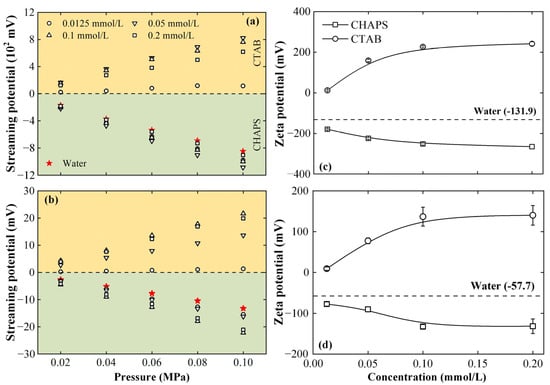 The relationships between the streaming potentials and the hydrodynamic pressures, Es/ΔP, were obtained by linear regression, and the zeta potentials at the ceramic/lubricant and steel/lubricant interfaces were calculated using Equations (A12) and (A15), respectively, as shown in Figure 5c,d. With the increase in CHAPS (or CTAB) concentration, the zeta potentials of the two materials show the same change trend: CHAPS does not change the polarity of the zeta potential, while CTAB can change that with the concentration of only 0.0125 mmol/L. Increasing the concentrations of both surfactants can increase the zeta potential amplitude. It is well known from the Helmholtz–Smoluchowski equation that the polarity and amplitude of the zeta potential affect the direction and velocity of electroosmosis, respectively, as shown below,