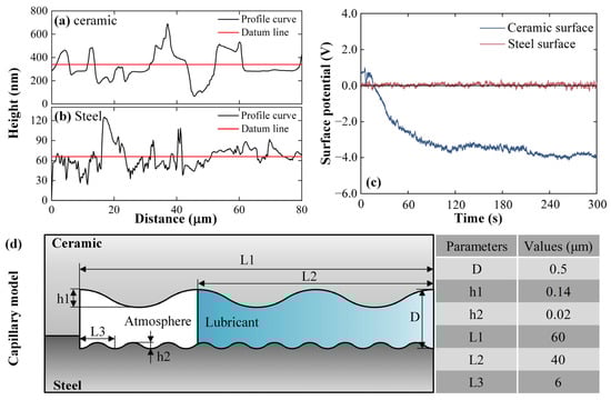 Profiles of (a) ceramic and (b) steel worn surfaces, (c) triboelectrification electrostatic potentials of steel and ceramic surfaces, and (d) capillary model of friction interface.
