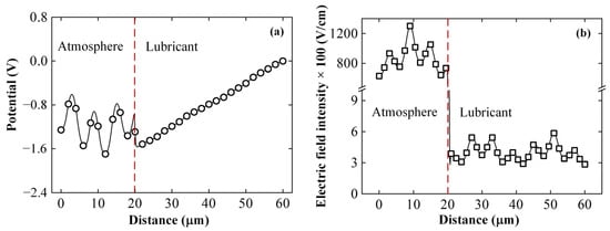 Laplace’s equation was used to describe the electric field distribution within the capillary to explore the effect of the electric field generated by the material triboelectrification on the lubricant penetration behavior at the ceramic/steel interface. According to the results of triboelectrification between the ceramic and steel, high potentials were loaded on the capillary wall bulges that were not submerged by the lubricant, which was −3.53 and 0.04 V, respectively. The lubricant was loaded with zero potential because it was placed in the grounding ball pot. The simulation results are displayed in Figure 7. Figure 7a depicts the potential distribution within the capillary. The potential in the lubricant gradually increases from the capillary inside to the outside, indicating that the electric field direction within the lubricant points to the inner end of the capillary. Figure 7b shows the electric field intensity values at the capillary center. It is seen that due to the periodic distribution of the micro-bulges on the capillary walls, the electric field intensity within the capillary inner end fluctuates around 8 × 104 V/cm, which is sufficient to induce gas discharge. This is close to the results observed in Nakayama’s experiments [], indicating the rationality of the finite element model used in this paper. Due to the higher dielectric constant of the lubricant compared to the air, a sudden drop in electric field intensity occurs at the interface of gas and liquid when it decreases from the inside to the outside. In addition, the electric field intensities within the lubricant are about 300–600 V/cm, meeting the strength condition for inducing the lubricant electroosmosis [,].