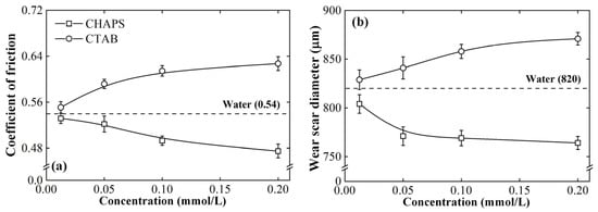 The effects of surfactant concentration on the tribological performance of the lubricants are shown in Figure 8. The coefficient of friction (COF) and WSD gradually decreased with the increase in CHAPS concentration but increased when CTAB was used. The COF and WSD of 0.2 mmol/L CHAPS lubricant were 12.5% and 6.8% lower than water, whereas 0.2 mmol/L CTAB lubricant produced 15.5% and 6.2% increases, respectively. The difference in tribological performance might be related to the penetrability of the lubricants and the lubricity of the surfactants.