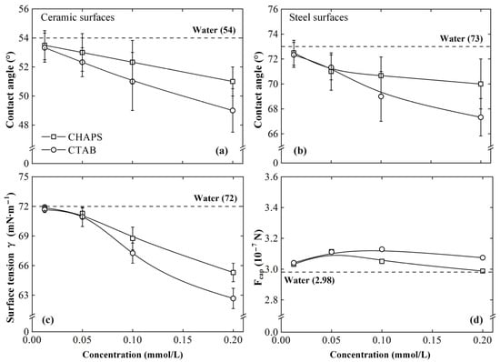 Figure 10a,b exhibit the contact angles of lubricants on ceramic and steel surfaces. The increase in surfactant concentrations leads to a reduction in contact angle for both CHAPS and CTAB lubricants. The contact angles of the 0.2 mmol/L CHAPS on the ceramic and steel surfaces were 5.6% and 4.1% lower compared with water, respectively. However, the contact angles produced using the 0.2 mmol/L CTAB were 9.3% and 7.8% lower than those of water. Figure 10c shows the effects of the surfactants on the lubricant surface tension. The surface tension of the lubricant decreases continuously with increasing CHAPS or CTAB concentration. When the surfactant concentrations increase to 0.2 mmol/L, the surface tension decreases by 9.5% and 13.1%, respectively. This is because the positive adsorptions of CHAPS and CTAB on the liquid surface can reduce the liquid surface tension []. It is known from the capillary force equation that the conventional capillary penetration is mainly affected by the liquid surface tension and contact angle, as shown below: