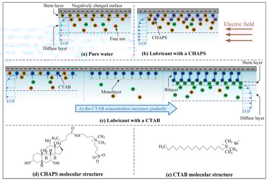Surfactants impact the EOF rate and orientation by dynamically coating the solid surface []. As a zwitterionic surfactant, CHAPS can be absorbed on the negatively charged surface through electrostatic interaction between its positive amino group and the surface. Moreover, its negative sulfonic group attracts the cations in liquid bulk, causing an increase in the number of the free ions in the diffuse layer, thereby increasing the electroosmotic velocity [,], as shown in Figure 11b. Therefore, adding the appropriate amount of CHAPS can improve the lubricant penetrability at the friction interface, showing a better tribological performance. As a cationic surfactant, CTAB’s positive group is absorbed on the charged surface. With increasing concentration, the surface was first gradually neutralized by forming a CTAB monolayer and then positively charged by forming a CTAB bilayer, as shown in Figure 11c. As a result, the electroosmotic velocity first decreases to zero and then increases in reverse [,]. Thus, adding the appropriate amount of CTAB can suppress the penetrability of the lubricant, presenting worse tribological properties.