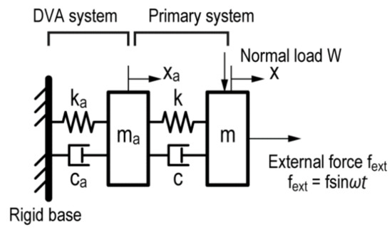 Harik and Issa [20] quantified the vibration suppression effect of the DVA in a configuration similar to the one used in this study, but without a sliding surface. In their model, a harmonic external force fext was applied to the primary mass, as shown in Figure 3. The equation of motion for the analysis model shown in Figure 3 is the same as when the friction force F in Equation (1) is replaced with the periodic excitation force fext (=fsin(ωt)), where f and ω are the amplitude and angular frequency, respectively, of the periodic external force.