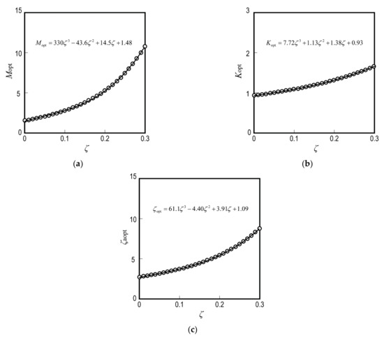 Using numerical techniques, Harik and Issa [20] found an optimally tuned mass ratio Mopt (=ma_opt/m), optimally tuned stiffness ratio Kopt (=ka_opt/k), and optimally tuned damping ratio ζaopt (=ca_opt/(mk)0.5) under different damping ratio ζ (=c/(mk)0.5) values. As shown in Figure 4, we calculated a best fit curve for the results of Harik and Issa [20] to determine the ζ dependence for each optimally tuned parameter. The resulting formulae are as follows: