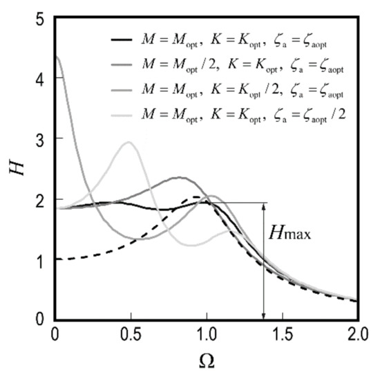 Figure 5 shows the vibration response curve under different DVA parameter conditions with ζ = 0.1, where H (=kx/f) and Ω (=ω/ωn) are the dimensionless displacement and the forced frequency ratio, respectively; Hmax is the maximum dimensionless displacement under each condition. As seen in Figure 5, Hmax is greatly reduced when the optimally tuned DVA parameters are applied.