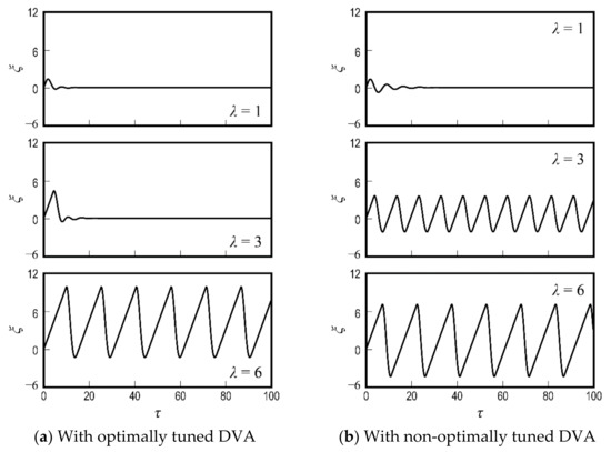 Figure 7 shows the results of the numerical simulation. The parameters were set as follows: (a) M = Mopt, K = Kopt, ζa = ζaopt, ζ = 0.1, and γ = 2, and (b) M = Mopt, K = 2Kopt, ζa = ζaopt, ζ = 0.1, and γ = 2. Thus, the results in Figure 7a,b correspond to the use of the optimally tuned DVA and the non-optimally tuned DVA systems, respectively. Previous research shows that stick-slip occurs under a large λ condition [11]. Considering that an increase in λ corresponds to an increase in the normal load W, a decrease in velocity V, and a decrease in support stiffness k, the observed stick-slip characteristics exhibit typical stick-slip behavior. Figure 7 clearly shows that setting the value for the DVA parameter strongly affects the occurrence and non-occurrence of stick-slip.