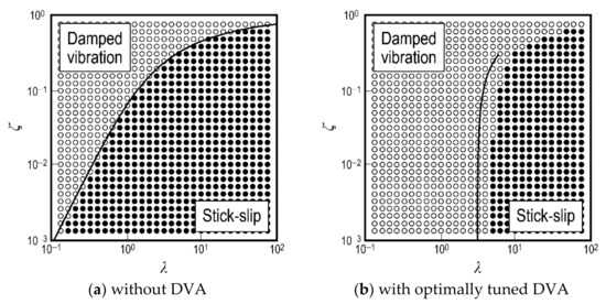 In contrast, in Figure 8b, the stick-slip occurrence condition was determined by the numerical simulation of the optimally tuned DVA vibration system shown in Figure 1, where the solid line in Figure 8b is based on Equation (37). That is, it is the map of stick-slip occurrence and non-occurrence conditions when the parameters of the elastic foundation are set to optimal values based on dynamic absorber theory. Comparing Figure 8a,b, the use of the optimized DVA works to narrow the stick-slip region under all conditions.