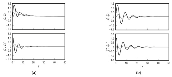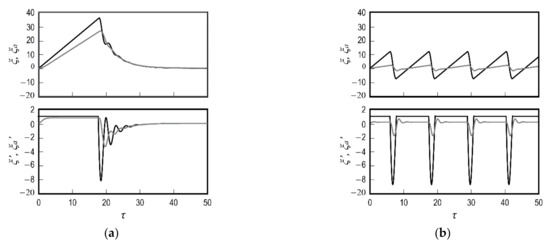 Focusing on the results in Figure 11a, it can be seen that the area of stick-slip occurrence is overwhelmingly narrower than in other conditions, which is a characteristic result. Figure 12 shows the time variations of dimensionless displacements ξ and ξa and dimensionless velocities and under λ = 1, ζ = 0.01. Under these conditions, stick-slip does not occur in either case and the initial fluctuations decrease and decay with time. A closer look reveals that for K = Kopt/2, i.e., Figure 12a, the oscillations of the main vibration system (black line) and the secondary vibration (DVA) system (gray line) are nearly in opposite phases. On the other hand, in case K = kopt × 2, i.e., Figure 12b, each mass point is oscillating in perfectly in-phase. Figure 13 shows the time variations of dimensionless displacements ξ and ξa and dimensionless velocities and under λ = 10, ζ= 0.01. In Figure 13a, stick-slip does not occur, but in Figure 13b, stick-slip is observed. This corresponds to the fact that in Figure 11, the stick-slip region is wide for K = kopt × 2 and extremely narrow for K = Kopt/2. From the above, it can be seen that the vibration modes have a significant effect on the stick-slip suppression observed in Figure 11a. In the case of K = Kopt/2, the two masses oscillate in opposite phases as a second-order mode, and their motions cancel each other out to produce the stick-slip suppression effect. In this case, stick-slip can be suppressed even at a higher λ than the condition predicted by the stick-slip occurrence discriminant formula shown in Equation (37). In other words, by setting the phases of the two masses well, it is possible to obtain a large vibration suppression effect beyond the vibration suppression effect of a general dynamic absorber. Although this effect is not discussed in depth in this study, it is considered to be an important finding for stick-slip suppression in 2DOF vibration systems.