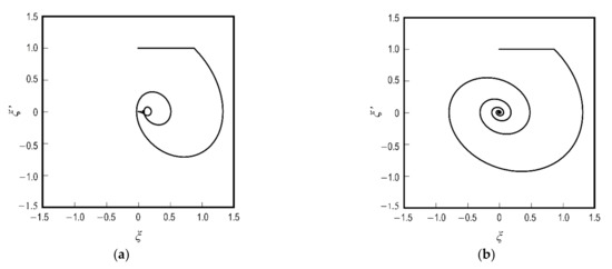 Figure 14 and Figure 15 show trajectories in a phase plane with ξ and an under λ = 1, ζ = 0.01 and under λ = 10, ζ = 0.01, respectively. Note that the calculation conditions for Figure 14 and Figure 15 are the same as those for Figure 12 and Figure 13. From the phase plane, the oscillation behavior of the main vibration system can be well understood visually. As shown in Figure 14, under relatively small λ conditions, the oscillations decay gradually, i.e., the orbit spirals toward the origin. On the other hand, for large λ, the behavior changes drastically. In the case of Figure 15a, where stick-slip does not occur, the vibration does not decay in a spiral manner as seen in Figure 14, but instead follows a peculiar trajectory. It is clear that the behavior under the same conditions cannot be approximated by a 1DOF vibration system, and results in the second-order mode of vibration behavior described above. In Figure 15b, where stick-slip occurs, a limit cycle is formed.