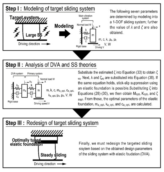 Finally, Figure 16 shows a design flowchart for stick-slip suppression by attachment to an elastic foundation. The following seven parameters are determined by modeling into a 1DOF sliding system; further, the value of λ and ζ are also obtained. By substituting the estimated ζ into Equation (33) we can obtain ζeq. Next, λ and ζeq are substituted into Equation (38). If the same equation holds, stick-slip suppression using an elastic foundation is possible. By substituting ζ into Equations (28)–(30), we can then obtain Mopt, Kopt, and ζaopt. From these, the optimal parameters of the elastic foundation, ma_opt, ka_opt, and ca_opt, are calculated. Finally, we redesign the targeted sliding system based on the obtained design parameters of the sliding system with elastic foundation (DVA).
