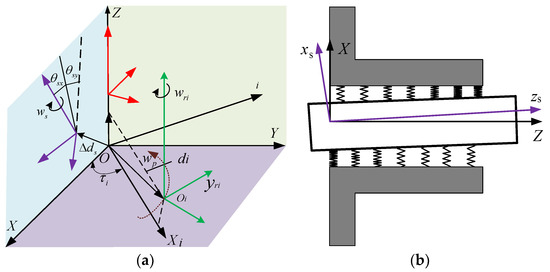 Figure 1 schematically shows the meshing principle of the PRSM with screw misalignments. As shown in Figure 1, the global coordinate system σ0(O: X, Y, Z) is fixed in space with its z-axis coincident with the axis of the screw without misalignments. The local coordinate systems σi(oi: Xi, Yi, Zi) are connected to the z axis of i# roller. Moreover, the local coordinate systems σs(os: xs, ys, zs), σri(ori: xri, yri, zri) and σn(on: xn, yn, zn) are rigidly connected to the axis line of misaligned screw and aligned roller and nut in space, respectively. θsx and θsy are the misalignment angle errors of the screw in the x and y directions, and Δds is the offset vector.