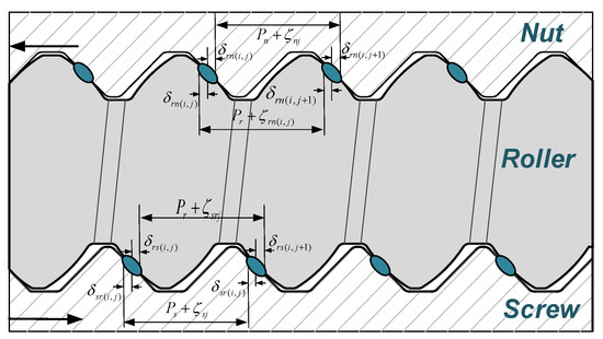 The load distribution can be calculated in accordance with the previously calculated axial clearances. In this study, the screw and nut are subjected to an axial tensile force and axial compressive force, respectively. The contact deformation of the PRSM is shown in Figure 2.