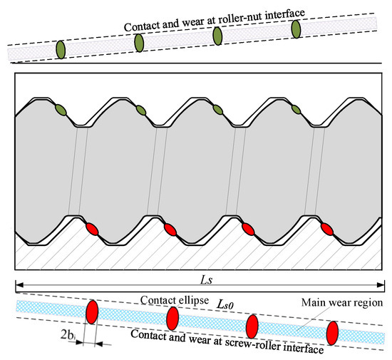 Figure 5 shows the contact and wear mechanism of the PRSM during operation. As shown in Figure 5, the shaded parts are the main wear region that may be considered as rectangular with a width of 2bi. According to the modified Archard wear theory [28], the amount of wear volume at the screw-roller interface under normal load can be written as: