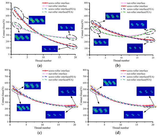 In order to validate the proposed model of load distribution, the finite element method is carried out in different misalignments. As shown in Figure 10, the normal contact stresses decrease at the screw-roller and roller-nut interfaces with the growth of the thread number, and the stresses at the roller-nut interface are more uniform than those at the roller-nut interface. Then, Figure 11 shows the comparison of load distribution between the finite element results and the numerical calculation for the 2# roller in different misalignments. It can be found from Figure 11 that the contact forces by the proposed model are very similar to those provided by FEA, and the results of FEA are slightly more uneven than those of numerical calculation. As mentioned earlier, the proposed model ignores deformations other than Hertzian contact and axial compression deformations. To sum up, the analytical results are consistent with the simulation results; thus, the accuracy of the proposed model of load distribution is verified.