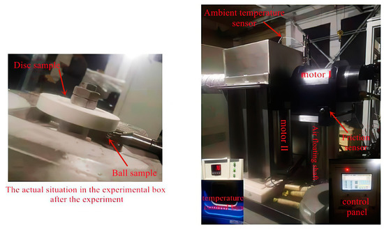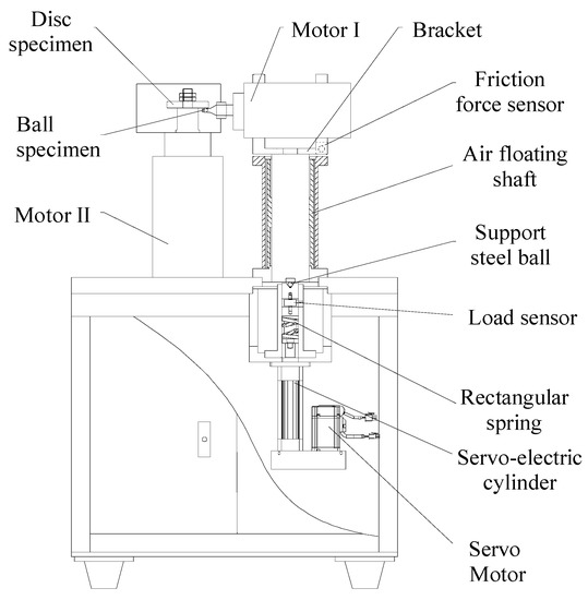 Considering the slowness of electric cylinder loading, the ball and disc speeds were first brought to a pure rolling state before loading. When the required load was applied, the program automatically changed the rotational speed of the ball and disc to allow them to reach the corresponding sliding state for testing. The speed change of the two motors can be completed in a short time, which can ensure the small wear of the ball and disc specimens, reduce the systematic error of the test machine, and make the test results more accurate.