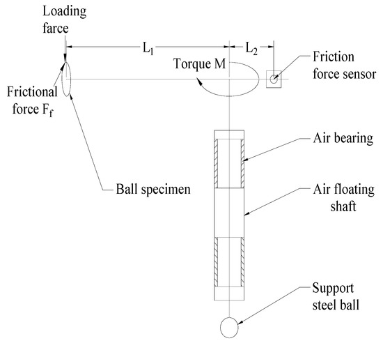 During the test, the servo motor controlled by PLC drives the servo-electric cylinder to move linearly and push the air bearing core upward to jack up the motor Ⅰ installed at the end of the air shaft to make the ball specimen contact with the disc specimen for the purpose of applying the load. The maximum normal load was 1500 N. The contact surface between the ball and the disc specimen deforms elastically under stress, extending the original point contact to a small radius circular contact surface. The frequency converter of the electric cylinder controls the value of the applied load. The friction force will be generated between the two contact surfaces if there exists relative sliding between the ball and disc specimens. Under the action of friction, the steel ball with motor Ⅰ and bracket deflects around the axis of the air-floating shaft, which compresses the friction force sensors fixed on the bracket. The actual value of the friction force is obtained from the test value of the sensor by lever conversion. Figure 3 shows the principle of friction force measurement. The friction force is calculated as: