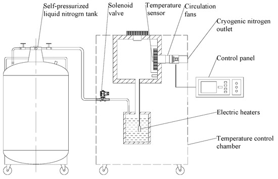 Figure 6 illustrates the cryogenic environment system with a cooling origin provided by liquid nitrogen in a self-pressurized liquid nitrogen tank. During the experiment, the valve of the self-pressurized liquid nitrogen tank is opened, and the liquid nitrogen flows into the temperature-controlled chamber. The solenoid valve in the temperature-controlled chamber automatically controls the inflow of liquid nitrogen, and the electric heating wire heats the liquid nitrogen to the specified temperature of low-temperature nitrogen. Then, the low-temperature nitrogen is injected into the test box, thus reducing the ambient temperature. In addition, liquid nitrogen can be injected directly into the test chamber to achieve a lower temperature. The test box was filled with PTFE with good cold resistance and low thermal conductivity at the installation gap. The test shows that the ambient temperature of the experimental chamber can be stabilized at −175 ℃, which meets the requirements of the ambient temperature of the test area. The temperature control chamber adopts an ST590 temperature controller with advanced PID functions and high-temperature control precision.