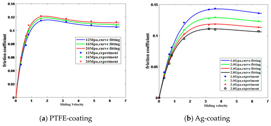 Figure 8 shows the fitted curves of Equation (9) under different testing conditions. There are high consistencies between the experimental data and fitted values, the relative error is generally within 5%, and the maximum error is no more than 10%. It is concluded that there is a higher accuracy when using Equation (9) to fit the friction coefficient of the PTFE coating and the Ag coating in cryogenic environment experimental data, which is suitable for engineering applications.