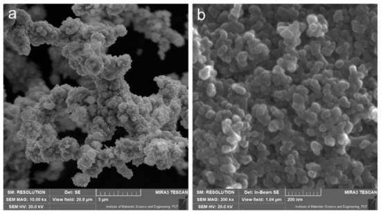 Commercially available nickel powder (99.7% purity, Sigma Aldrich, Saint Louis, MO, USA) was used for the matrix material of the sinters. Titanium (IV) chloride was used as the precursor for in situ microwave fabrication of TiO2. The preparation of the TiCl4 solution was carried out in distilled water in an ice-water bath according to the procedure previously reported by Zhang et al. [41]. The concentration of titanium (IV) chloride was adjusted to 1%. Subsequently, 1 g of urea was added to the 50 cm3 TiCl4 solution prepared in the previous step. During microwave heating, urea was decomposed into carbon dioxide and ammonia, which was a hydrolysis promoter and enabled in situ synthesis of TiO2 nanoparticles during microwave irradiation. Following the urea dissolution, the solution was transferred to a microwave reactor (Discover 2.0, CEM, Matthews, NC, USA) and heated with a maximum power of 300 W until a temperature of 200 °C was reached; it was maintained at this temperature for 1 min. The obtained titanium dioxide was filtered and washed, and finally dried at 80 °C for 12 h. The morphologies of the used powders are shown in Figure 1; the micro-scale nickel powder has a dendritic structure, and TiO2 powder is in the form of agglomerates. TiO2 nanoparticles have a spherical shape and size between 20–45 nm. In the first step, the powder mixture (Ni and 10 wt.% TiO2) was tumble milled for 1 h. Then, the moldings were manufactured by pressing powder mixtures at a pressure of 1.17 GPa. In the next stage, sintering was carried out at 1000 °C for 3 h in a tube furnace under an argon atmosphere. Sinters were cooled in the furnace at 25 °C/h rate. The produced sinters had a height of 5 mm and diameter of 4 mm. Figure 2 shows the XRD patterns of pure nickel powder, nano-TiO2 powder, and sintered material.