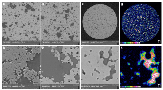 Microstructure of the molding (a,b), sinter (c–f), and EDS distribution map of titanium concentration (g,h).