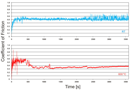 Coefficient of friction vs. time of friction of self-lubricating composite cooperating with Inconel®625-alloy at room temperature and 600 °C.