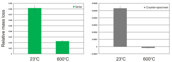 Relative mass loss of sinters and counter-samples at room temperature and 600 °C.