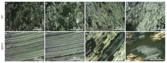 Worn surface of sinters and counter-samples after friction wear tests at 23 °C—sinter (a,b), counter-sample (c,d) and at 600 °C—sinter (e,f), counter-sample (g,h), LM.