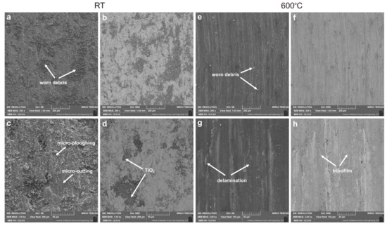 Worn surface of sinters after friction wear tests at 23 °C (a–d), and at 600 °C (e–h), SEM.